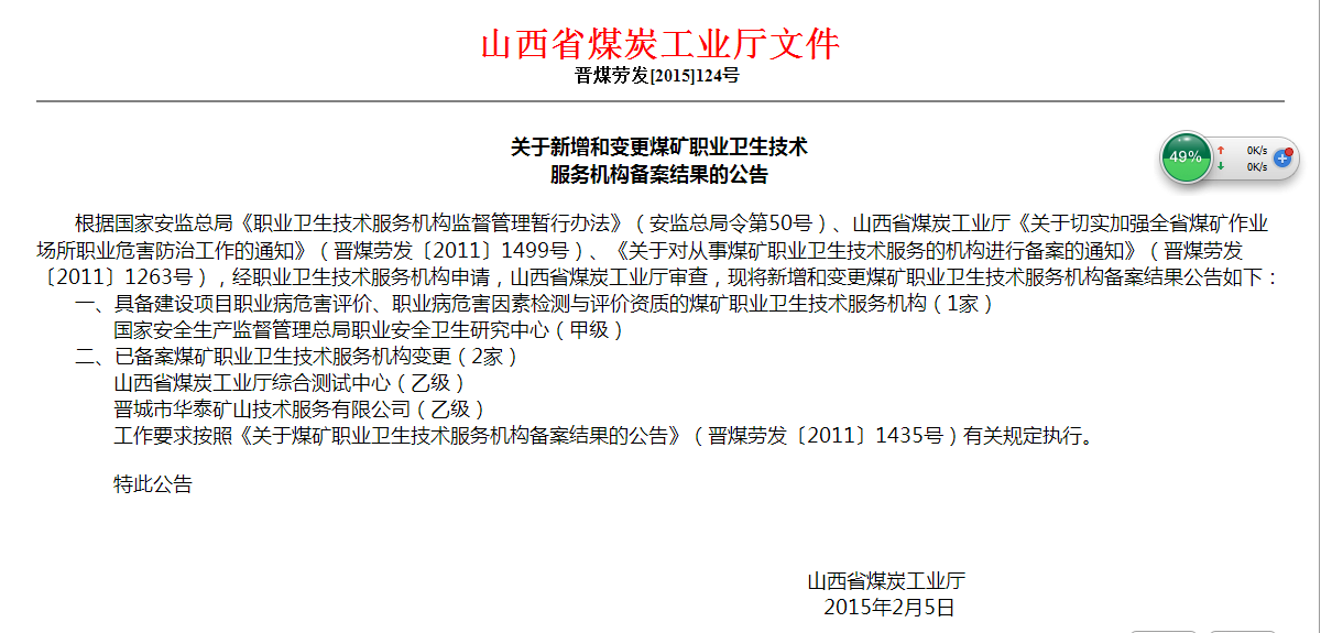 晉城國(guó)投華泰科技有限公司(以下簡(jiǎn)稱華泰公司)是一家經(jīng)營(yíng)性國(guó)有企業(yè),注冊(cè)資金1000.2萬(wàn)元(由晉城市華泰礦山技術(shù)服務(wù)有限公司和晉城澤泰安全技術(shù)服務(wù)有限公司合并整合組建,國(guó)投全資)。公司持有山西省衛(wèi)生健康委員會(huì)頒發(fā)的《職業(yè)衛(wèi)生技術(shù)服務(wù)資質(zhì)證書(shū)》、山西省應(yīng)急管理局頒發(fā)的《安全評(píng)價(jià)機(jī)構(gòu)資質(zhì)證書(shū)》和山西省市場(chǎng)監(jiān)督管理局頒發(fā)的《檢驗(yàn)檢測(cè)機(jī)構(gòu)資質(zhì)認(rèn)定證書(shū)》等資質(zhì),設(shè)施設(shè)備、能力、資質(zhì)配套齊全。...【詳細(xì)信息】